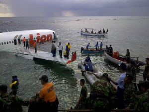 DENPASAR, 13/4 – MUSIBAH LION AIR. Sejumlah petugas gabungan melakukan evakuasi barang dan penumpang pesawat Lion Air yang tergelincir ke laut setelah berusaha mendarat di Bandara Ngurah Rai Denpasar, Bali, Sabtu (13/4). Pesawat Lion Air dengan nomor penerbangan JT-960 rute Bandung-Denpasar tergelincir di Bandara Ngurah Rai saat mendarat sehingga menyebabkan ratusan penumpang cedera. FOTO ANTARA/HO-BASARNAS/ss/ama/13.